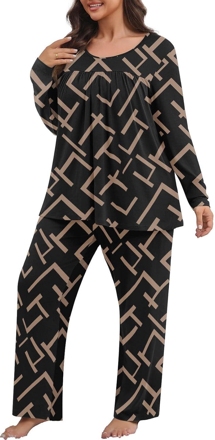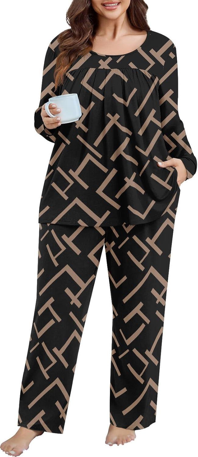 POSESHE Women’s Plus Size Pajama Sets Long Sleeve 2 Piece Crew Neck Lounge Sleepwear Ladies Cute Pjs Sets with Pockets 2025(Geometry Black)