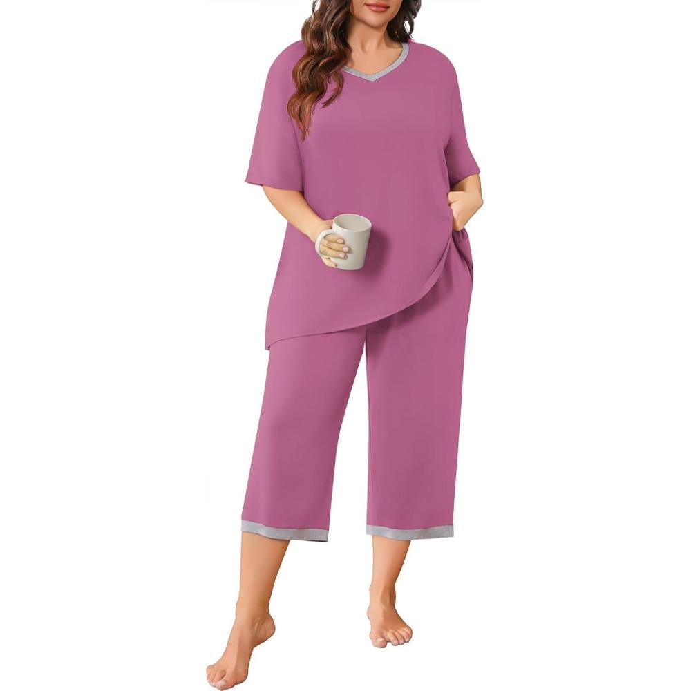 POSESHE Women’s Plus Size Pajama Sets Soft Pjs Long Pants Summer Lounge Sleepwear Pajama Sets(07-purple Red)