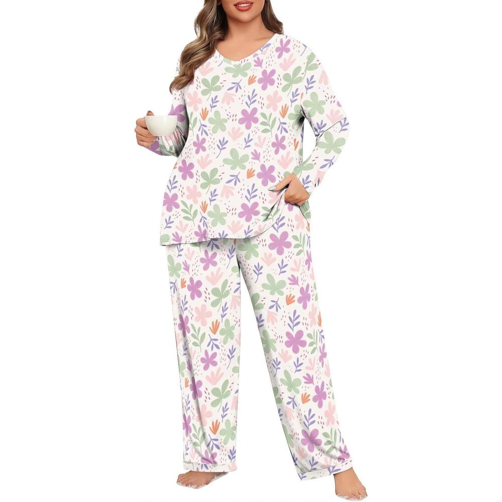 POSESHE Women’s Plus Size Pajama Sets Soft Pjs Long Pants Summer Lounge Sleepwear Pajama Sets(Purple Pink Leaf)
