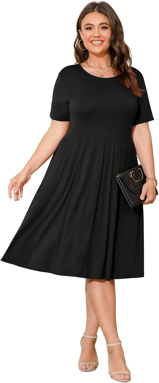 POSESHE Womens Plus Size Summer Dress 2025 Casual Short Sleeve Empire Waist Loose Fit Swing T-Shirt Dress with Pockets(B1-black)