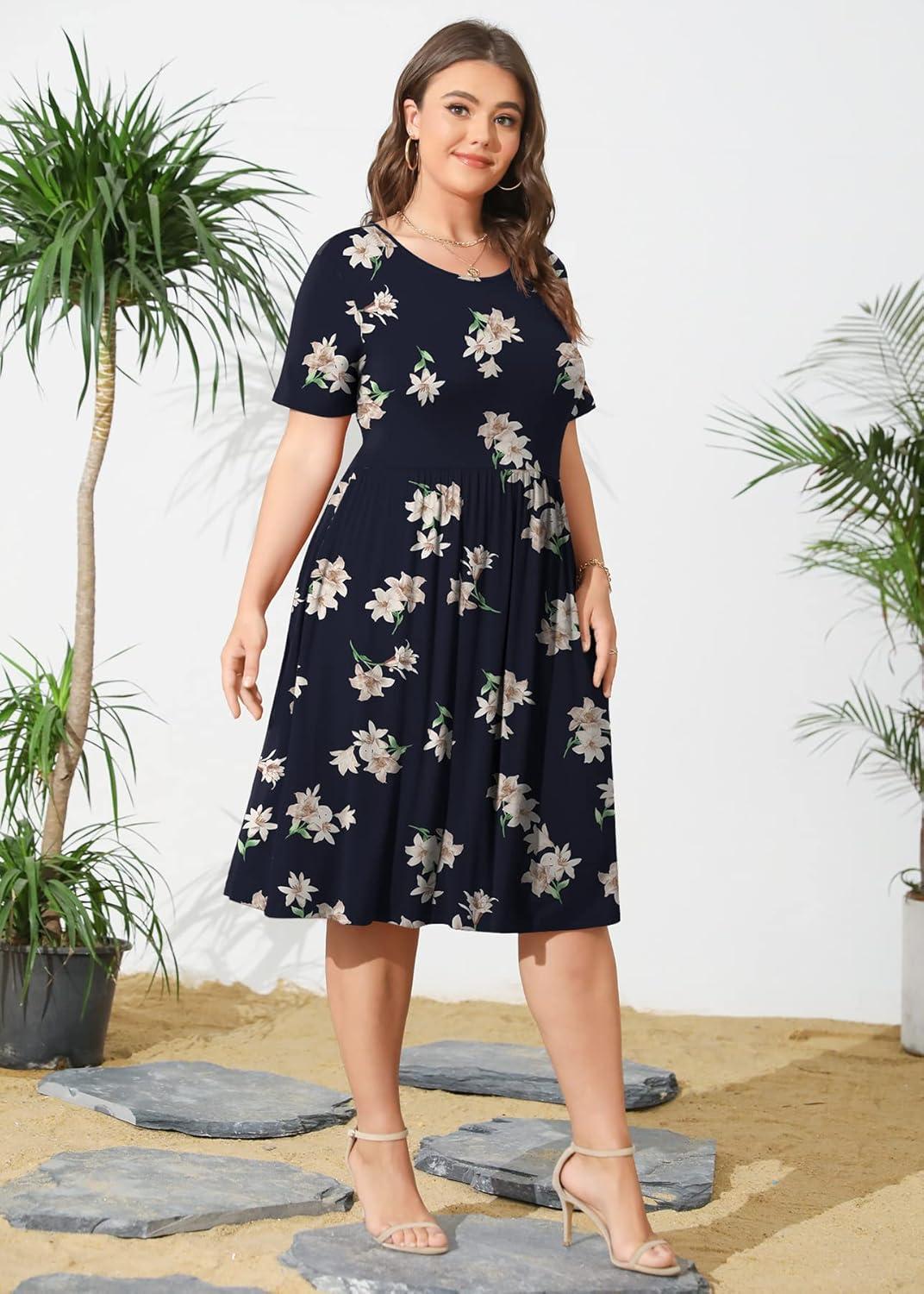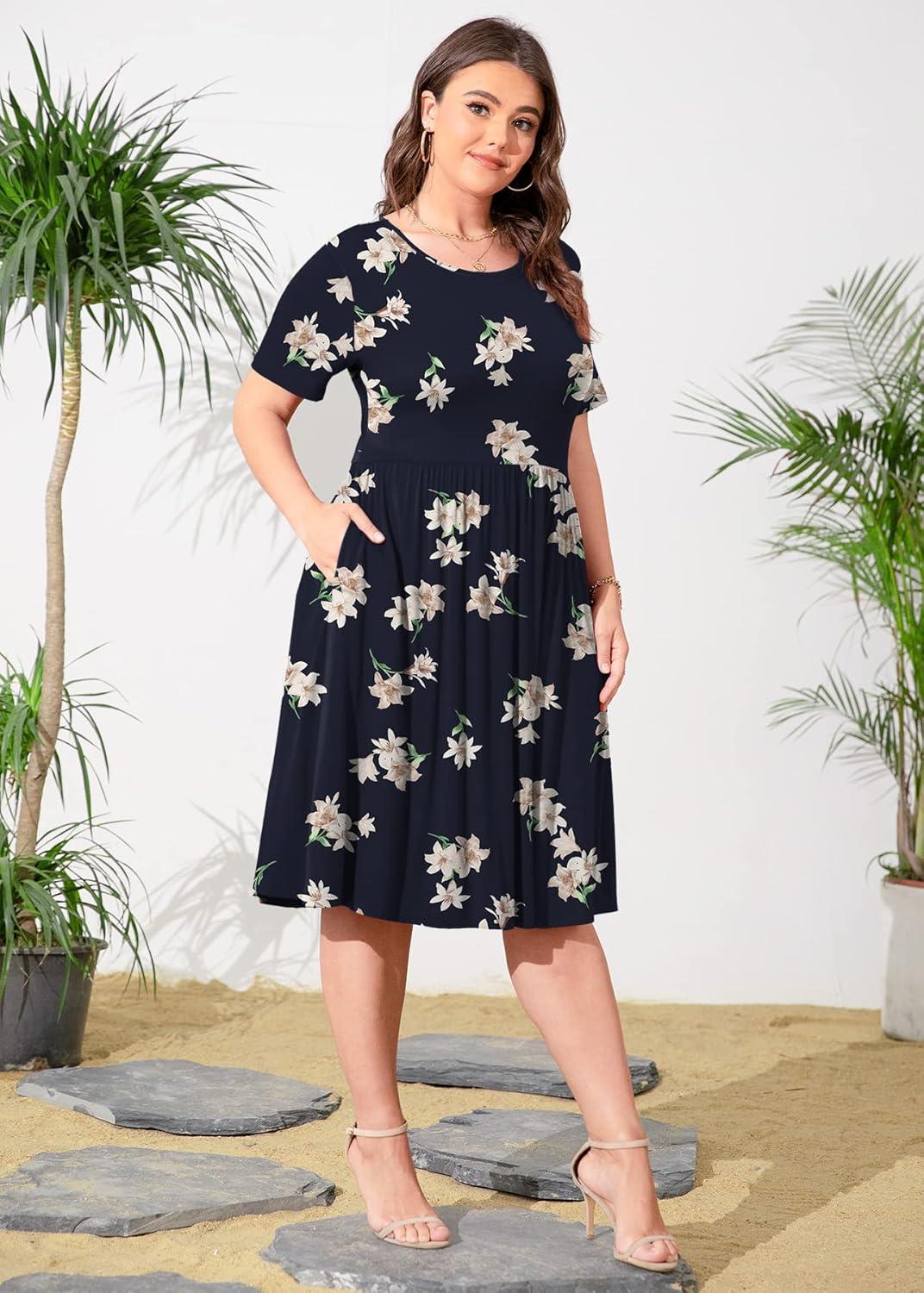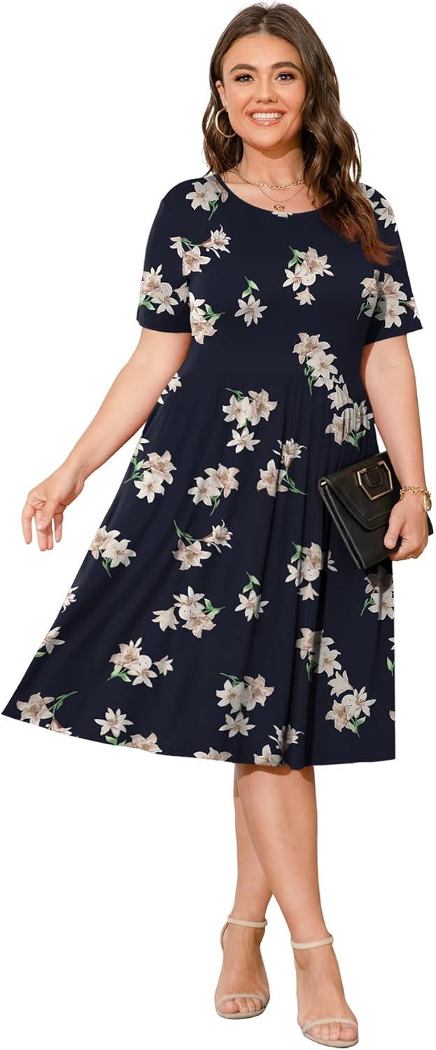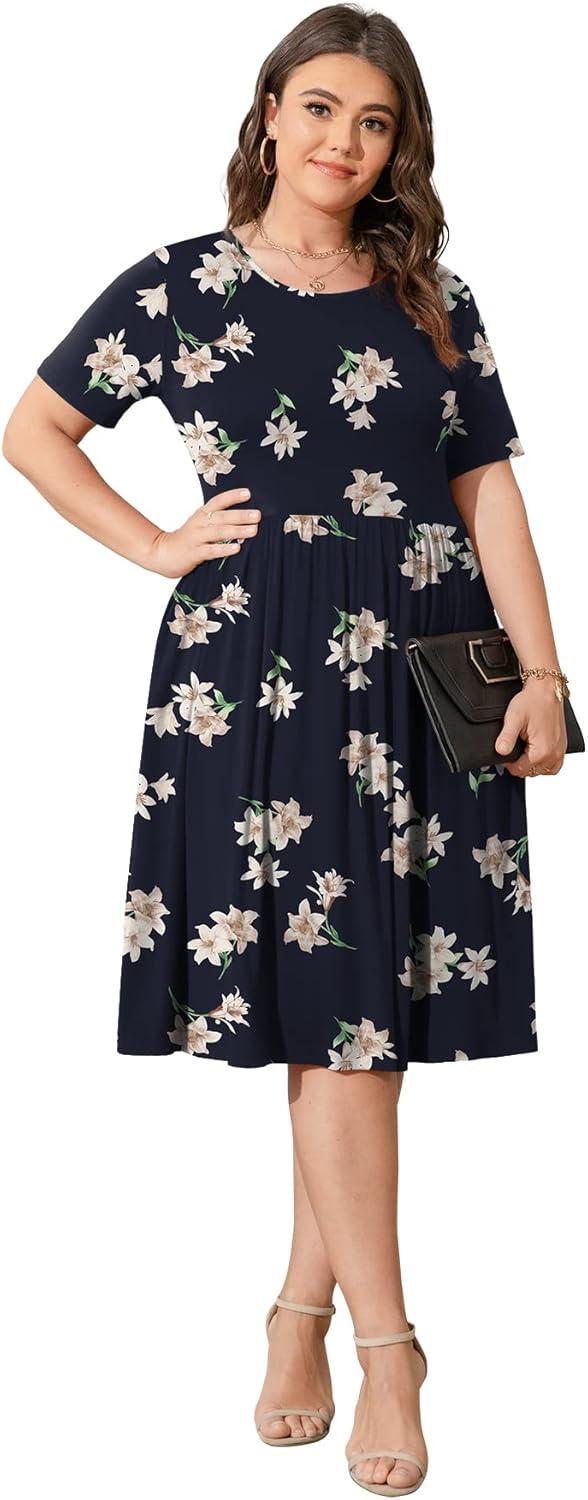 POSESHE Womens Plus Size Summer Dress 2025 Casual Short Sleeve Empire Waist Loose Fit Swing T-Shirt Dress with Pockets(B1-blue Lily)