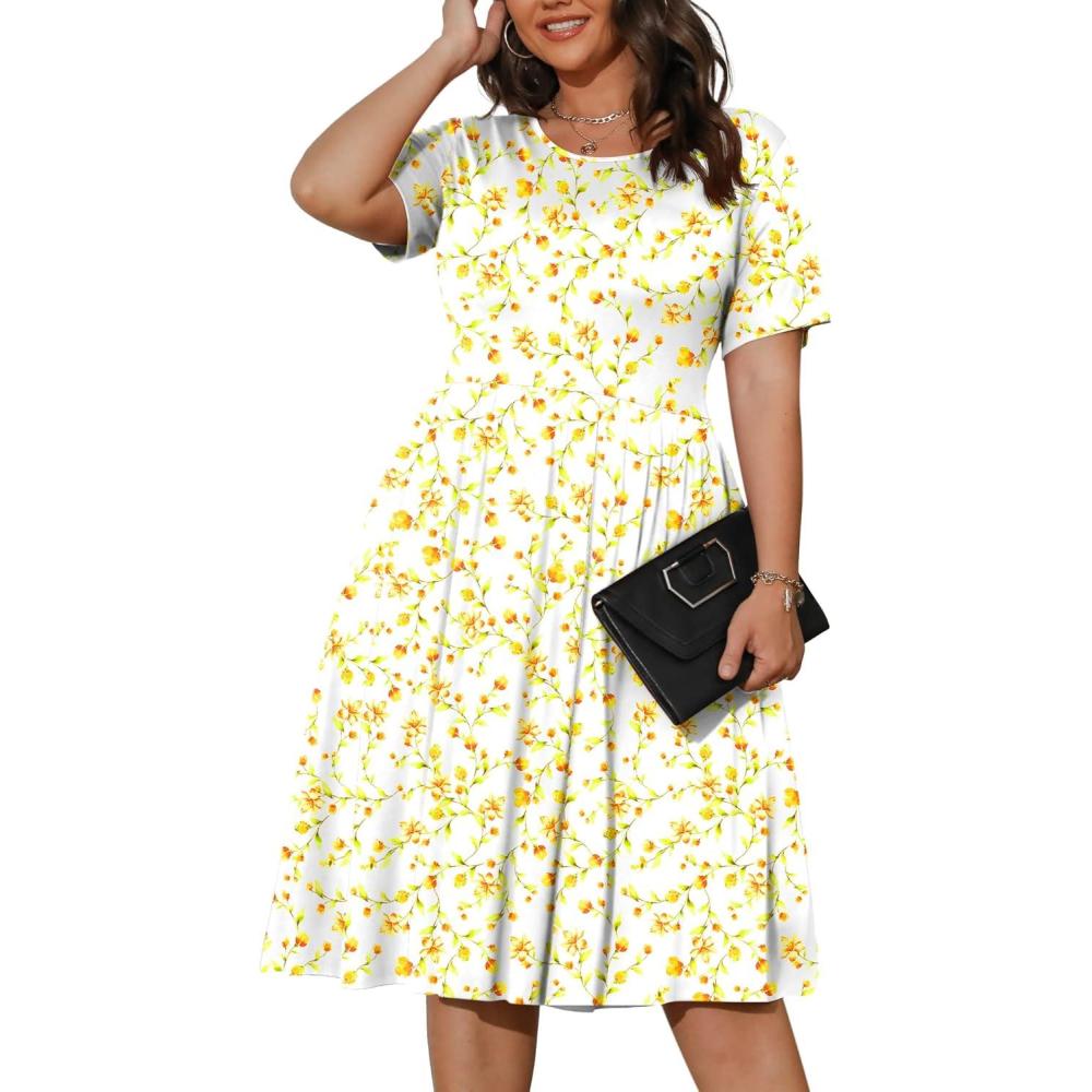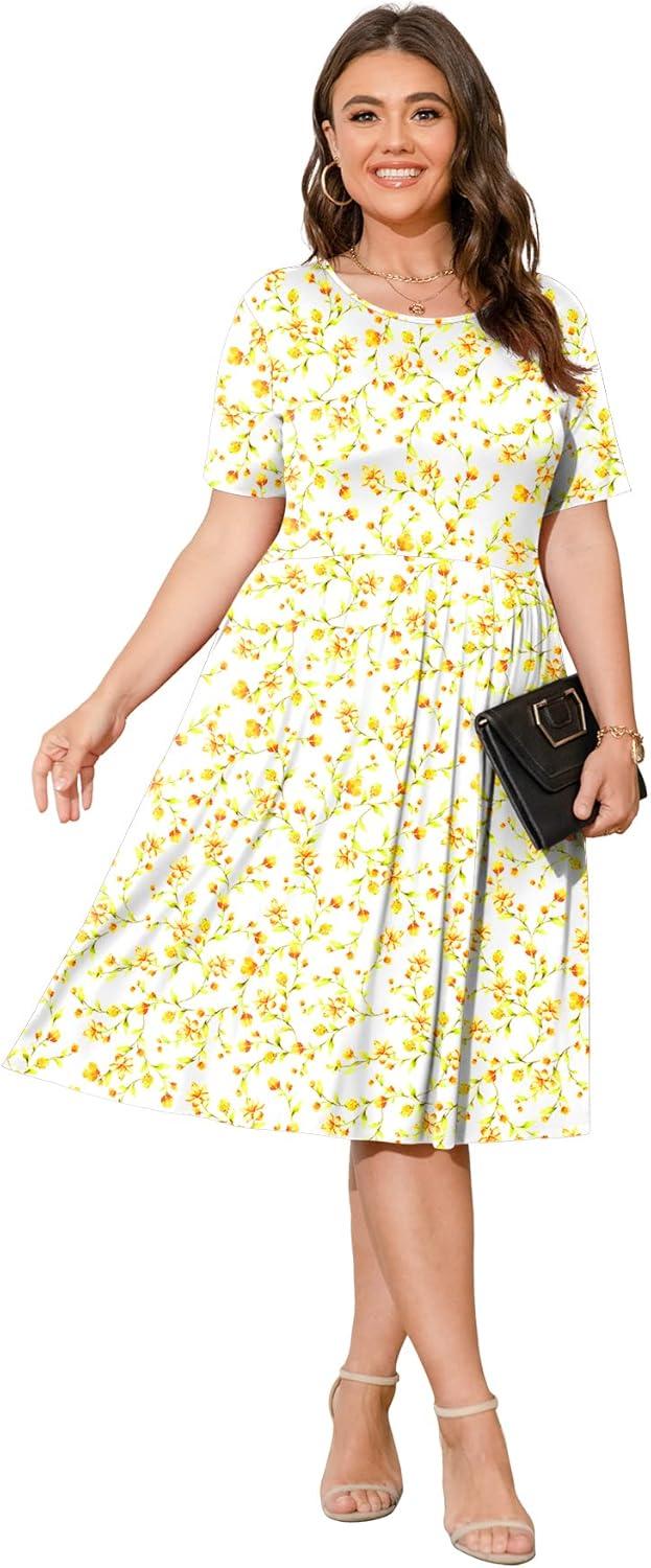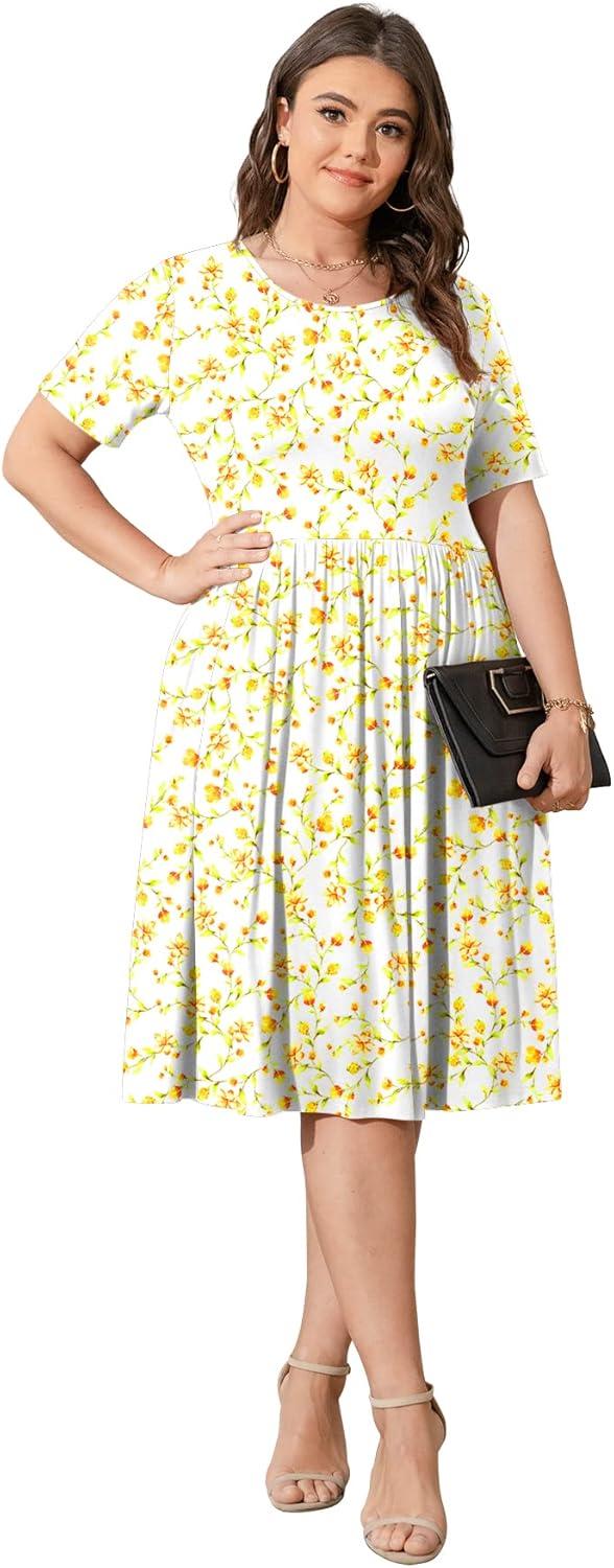 POSESHE Womens Plus Size Summer Dress 2025 Casual Short Sleeve Empire Waist Loose Fit Swing T-Shirt Dress with Pockets(B13-apricot Flower)