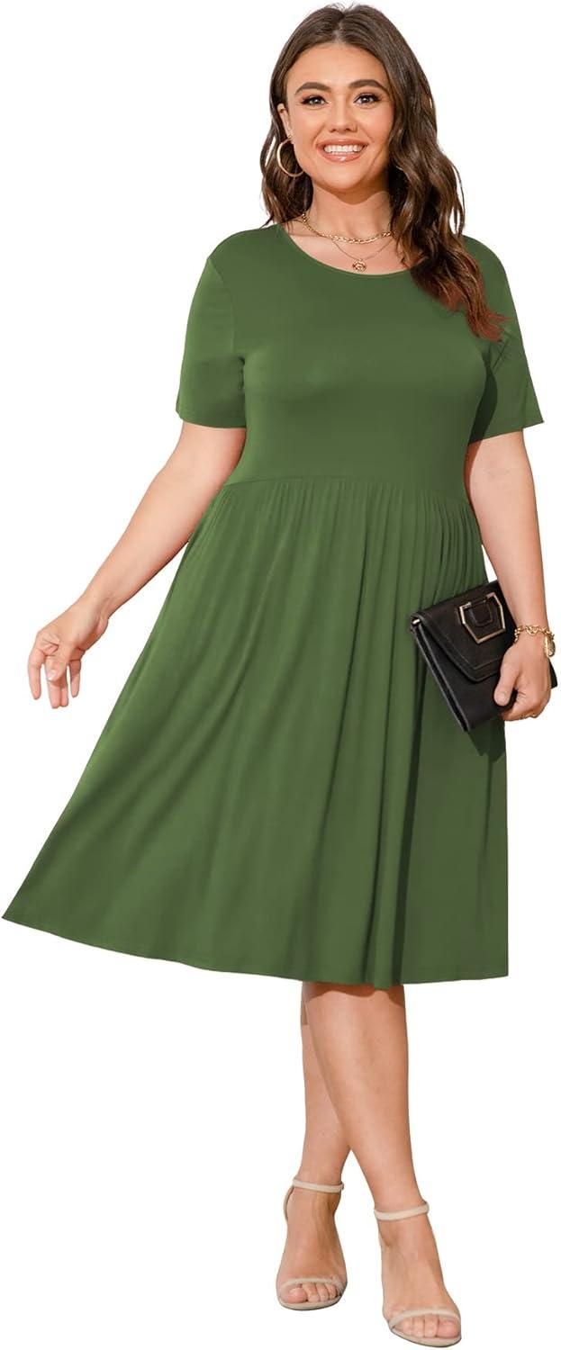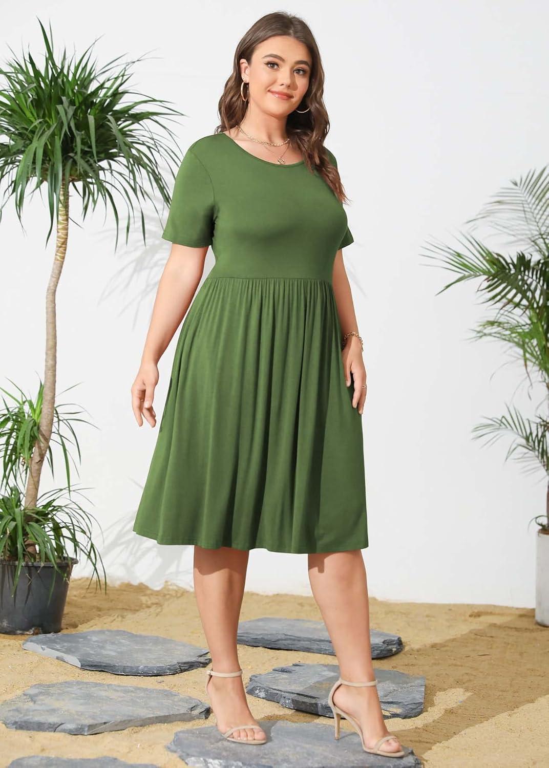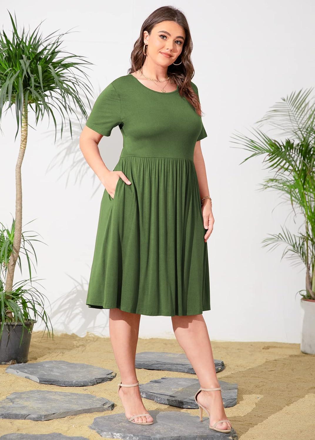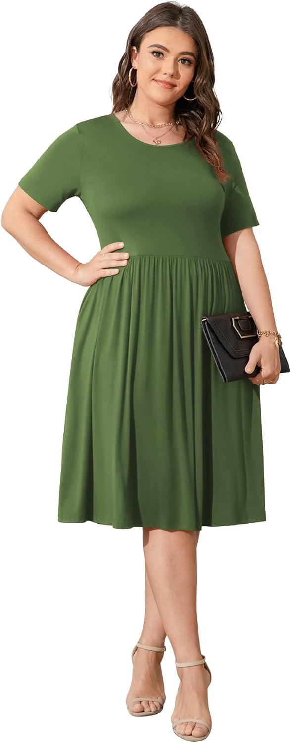 POSESHE Womens Plus Size Summer Dress 2025 Casual Short Sleeve Empire Waist Loose Fit Swing T-Shirt Dress with Pockets(B2-army Green)