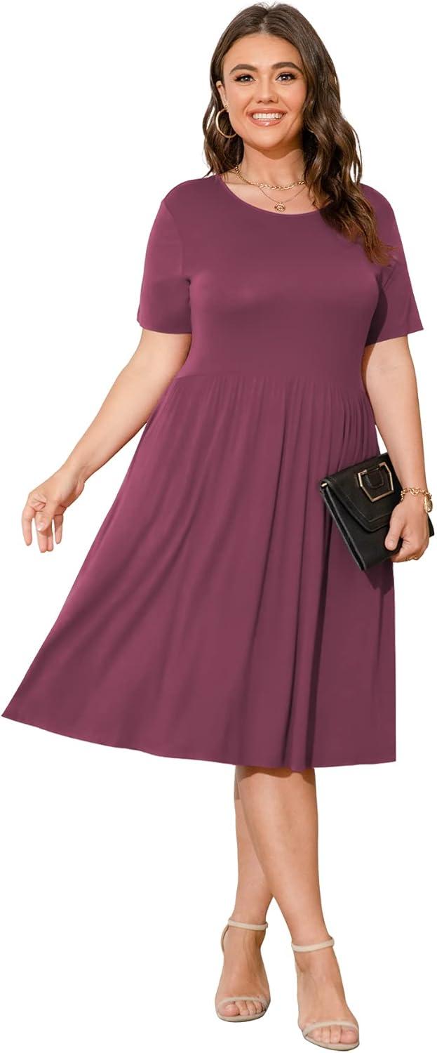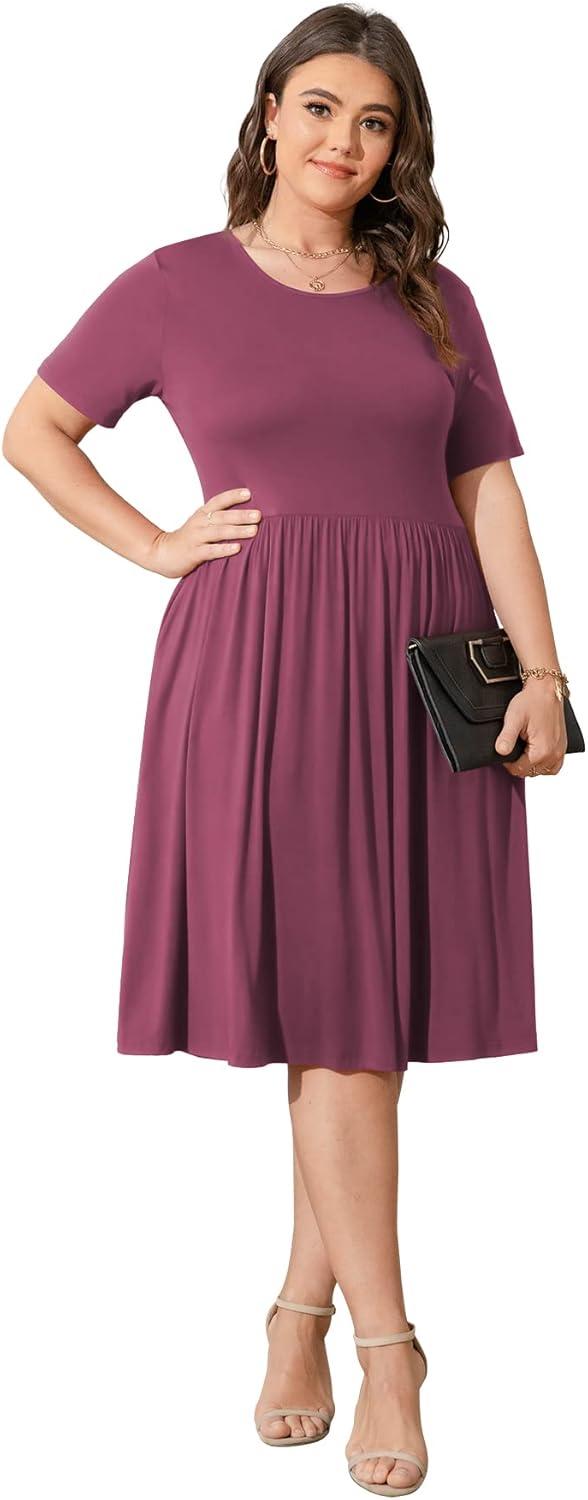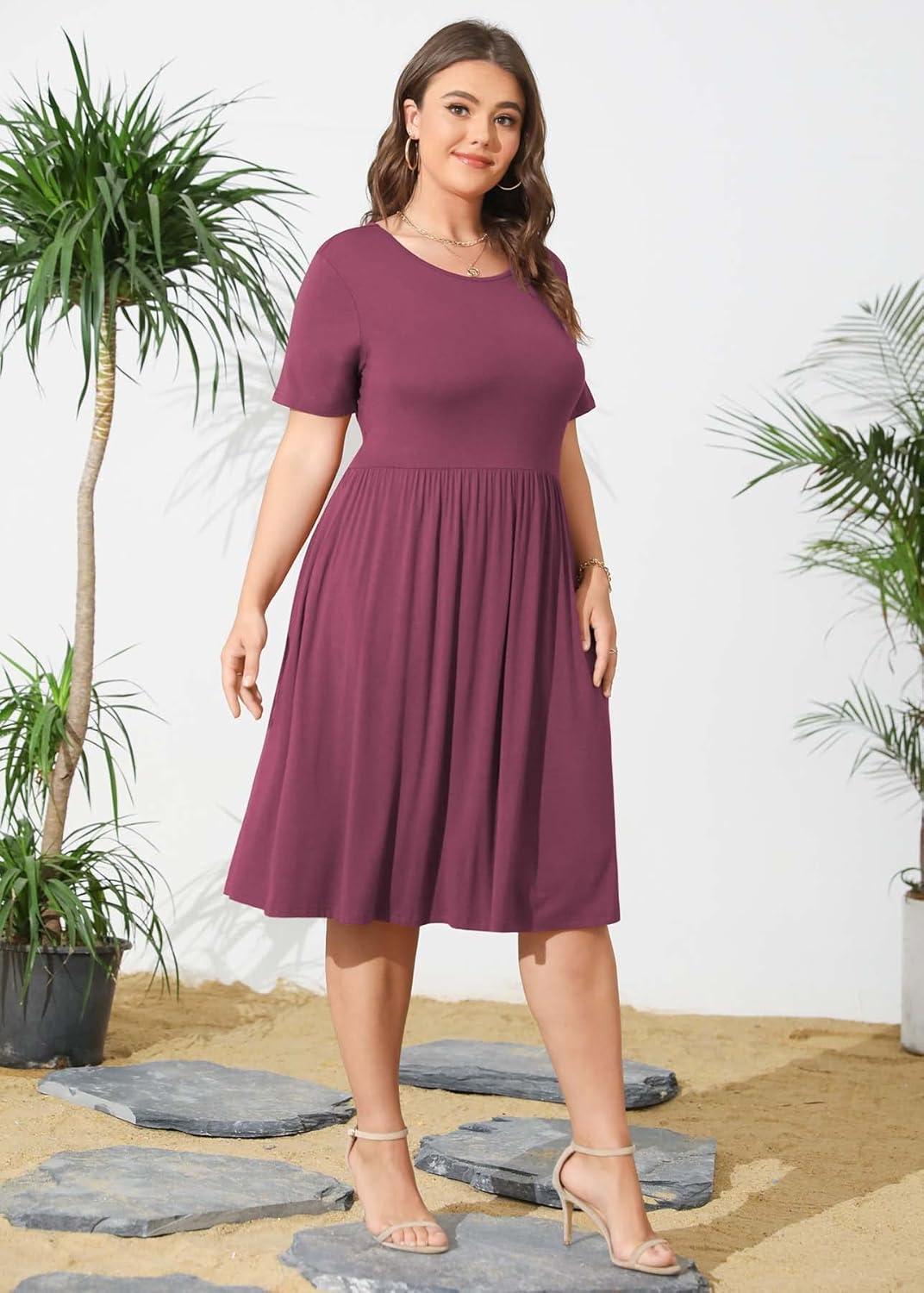 POSESHE Womens Plus Size Summer Dress 2025 Casual Short Sleeve Empire Waist Loose Fit Swing T-Shirt Dress with Pockets(B6-purple Red)