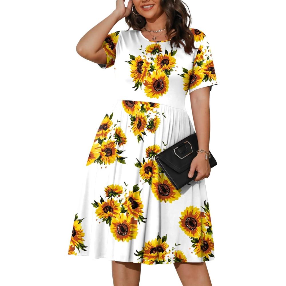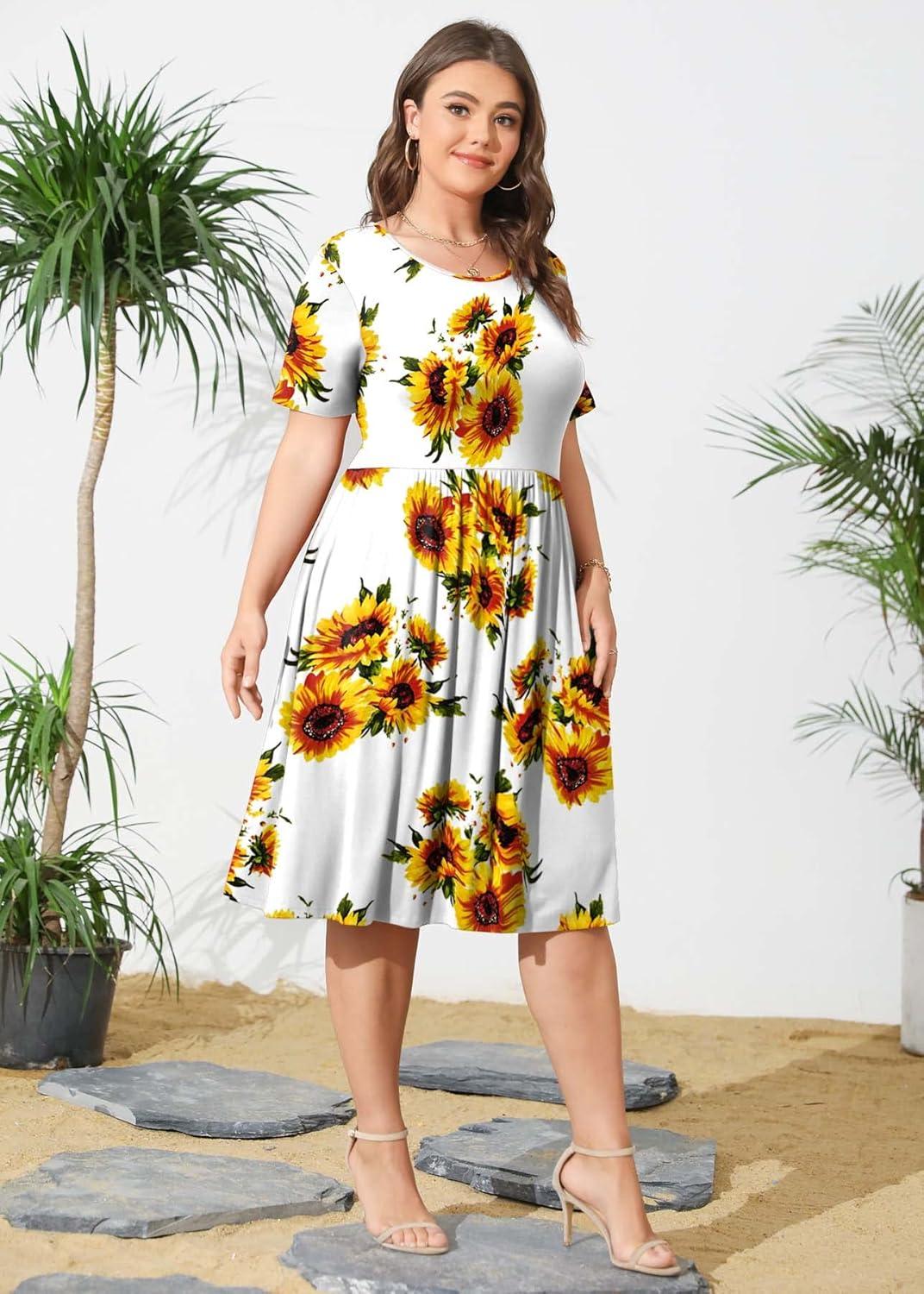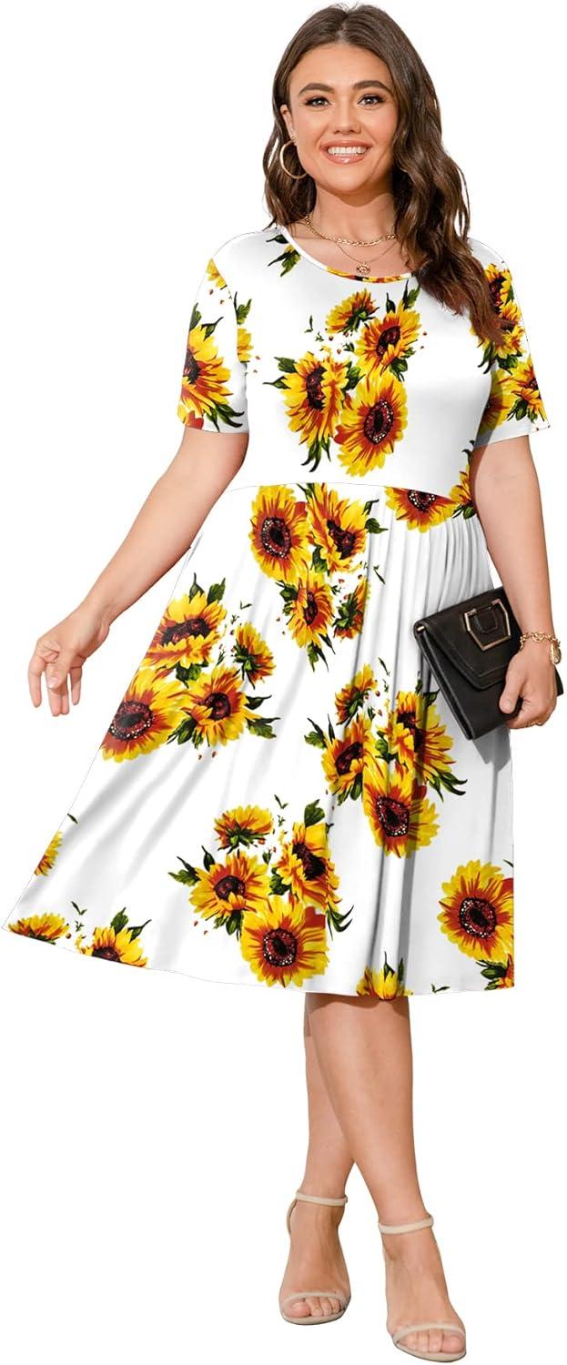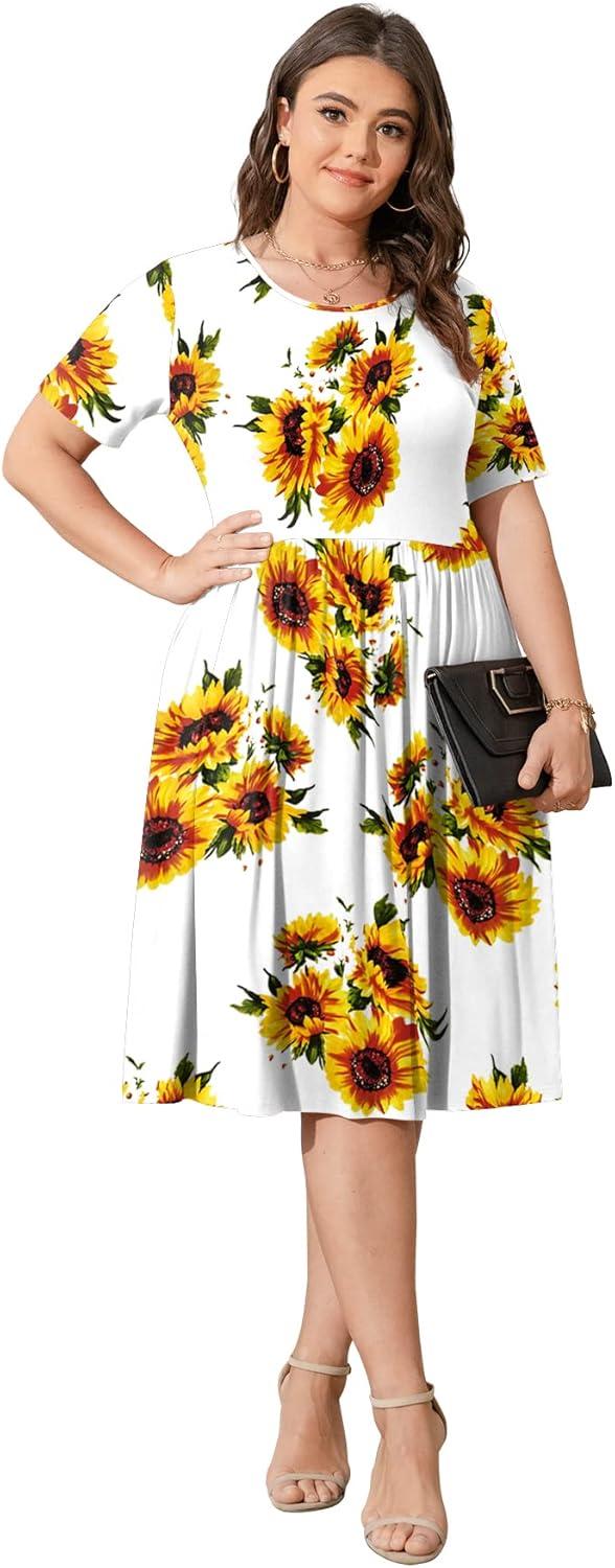 POSESHE Womens Plus Size Summer Dress 2025 Casual Short Sleeve Empire Waist Loose Fit Swing T-Shirt Dress with Pockets(B7-sunflower)