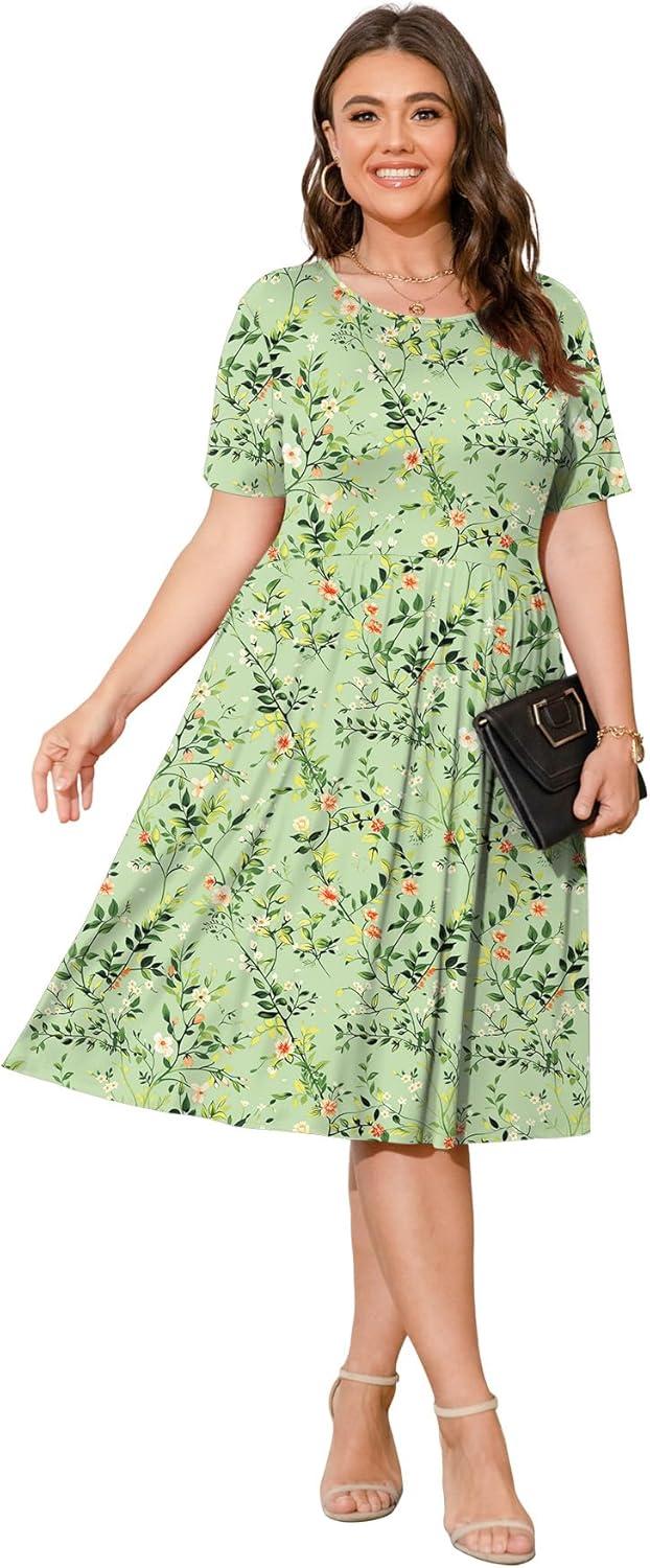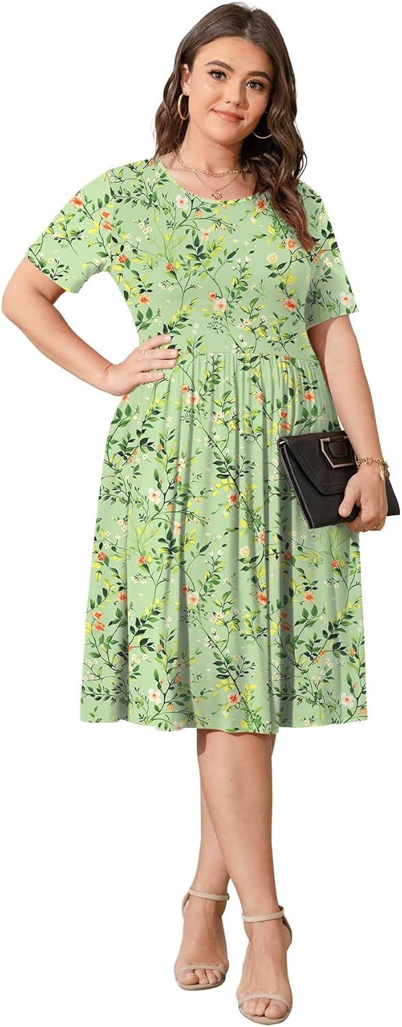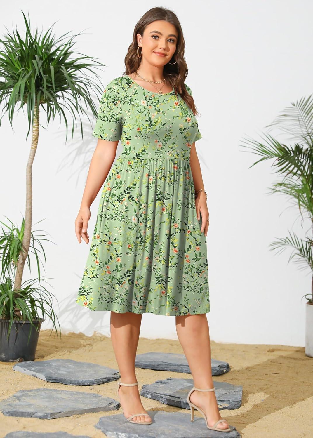 POSESHE Womens Plus Size Summer Dress 2025 Casual Short Sleeve Empire Waist Loose Fit Swing T-Shirt Dress with Pockets(Green White Floral)